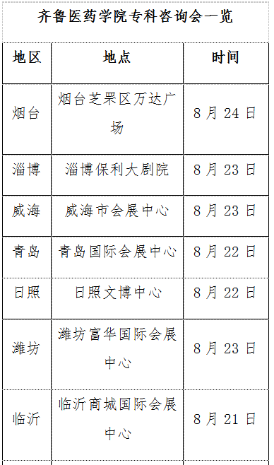 为了给考生提供权威、精准的专业介绍和填报志愿指导服务,继31场本科招生咨询会和东营、菏泽两市专科咨询会后,齐鲁医药学院将于近期组织招生办公室、各二级学院相关工作人员奔赴省内其他14市参加专科招生咨询会。