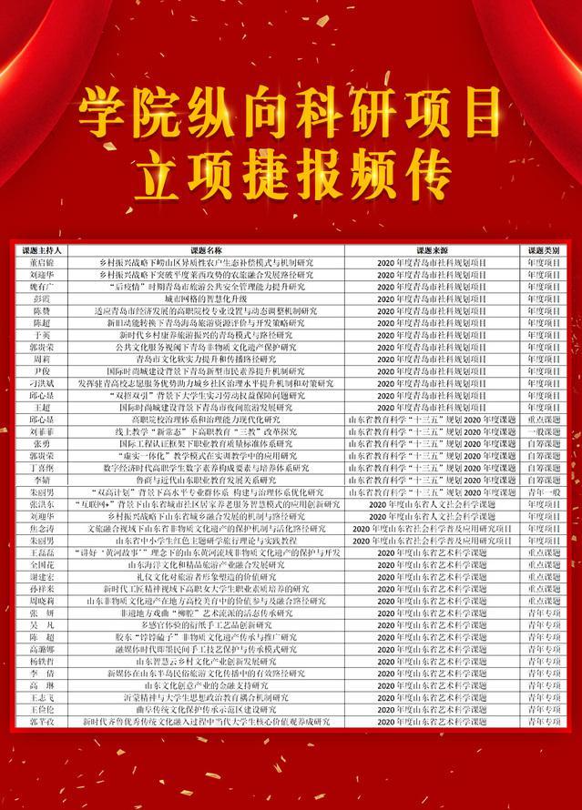 暑假期间,青岛酒店学院纵向课题立项捷报频传,近期共获得课题立项62项。其中,获得青岛市社科规划项目13项,山东省教育科学“十三五”规划2020年度课题7项,山东省社科联人文社会科学课题2项,山东省社科联社会科学普及应用研究项目2项,山东省艺术科学重点课题15项。另外,学院还获得山东省旅游职业教育专业建设指导委员会2020年度规划课题立项20项、山东软科学研究会“产教融合研究智库专项”2020年度课题3项。