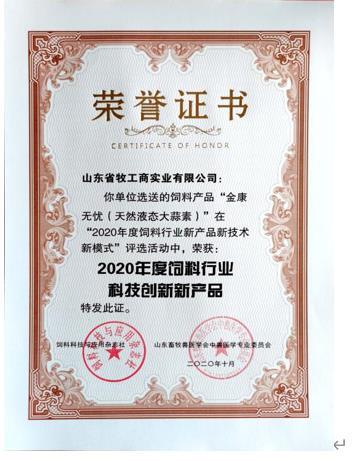 近日,由牧工商总代理并选送的饲料产品“金康无忧(天然液态大蒜素)”在“2020年度饲料行业新产品新技术新模式”评选活动中,荣获“科技创新新产品”称号。