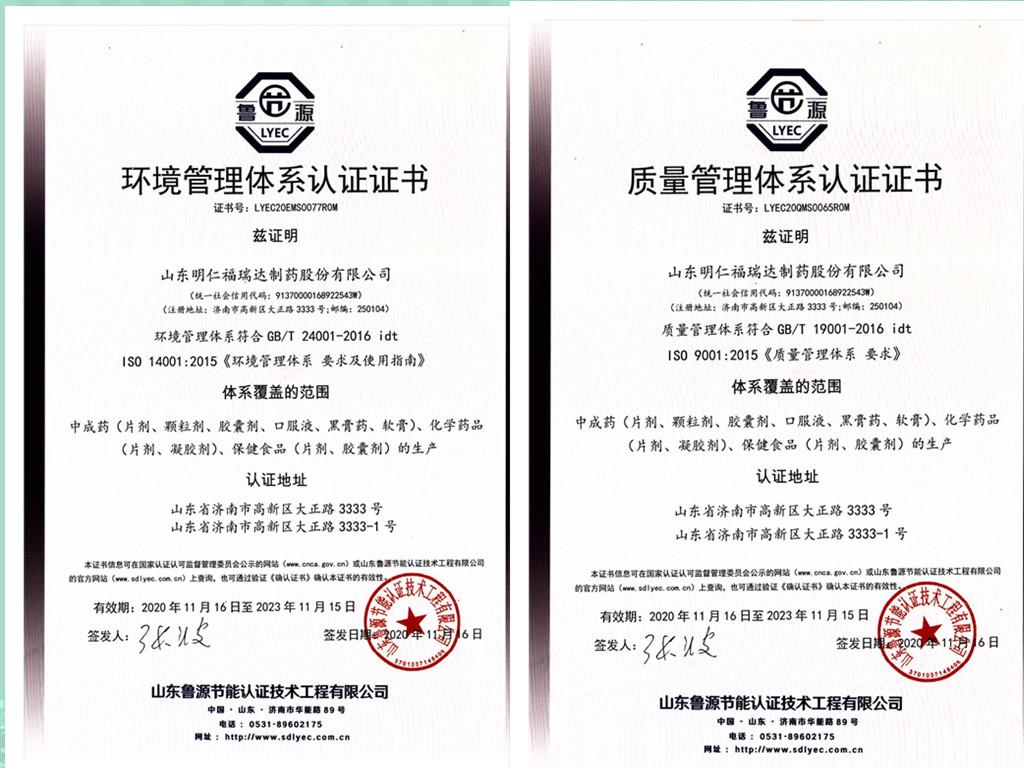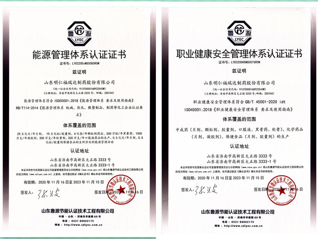 明仁福瑞达自推行四项管理体系以来,不断完善制度建设,严控产品质量、注重环境保护、优化能源结构、关注员工健康、紧抓安全生产,争做为员工提供安全工作环境、为人民提供优质健康产品的环境友好型企业。四项管理体系认证证书的取得,是对公司质量管理、环境管理、能源管理、职业健康安全管理等各项工作规范化、标准化的肯定。