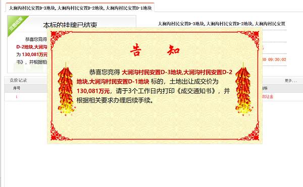 11月30日,鲁商发展通过济南公共资源网交易系统成功竞得宗地名称为大涧沟村民安置D-1地块、D-2地块和D-3地块国有建设用地使用权,成交总价款为130081万元,本次竞买事项在公司董事会授权经理层的范围内。