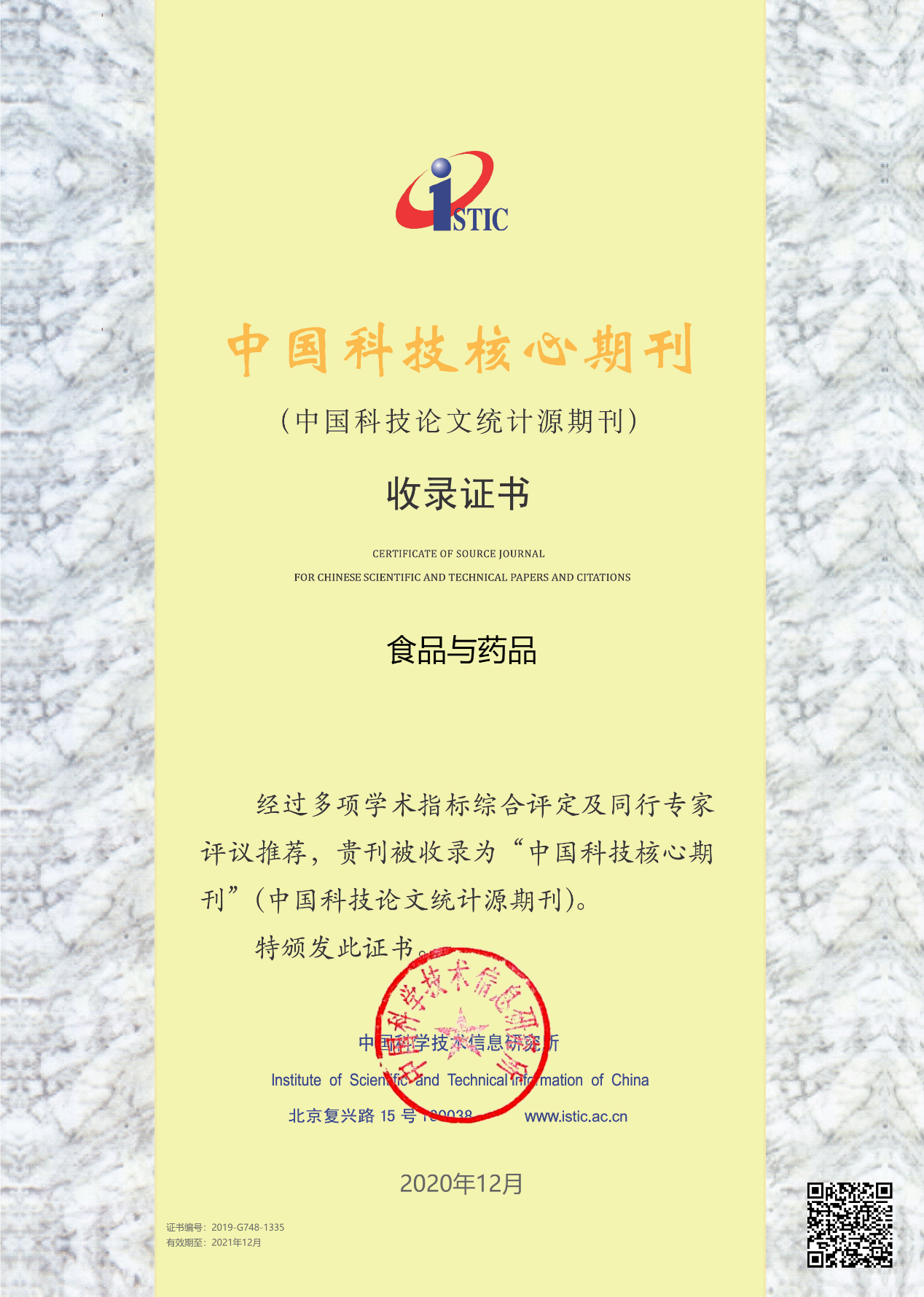 12月29日,中国科学技术信息研究所采取线上会议形式召开中国科技论文统计结果发布会。会上发布了2020年中国科技核心期刊目录,《食品与药品》实现连续多年入选此目录。