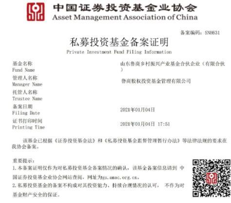 近日,由鲁商集团牵头发起设立的山东鲁商乡村振兴产业基金,在中国证券投资基金业协会完成备案。
