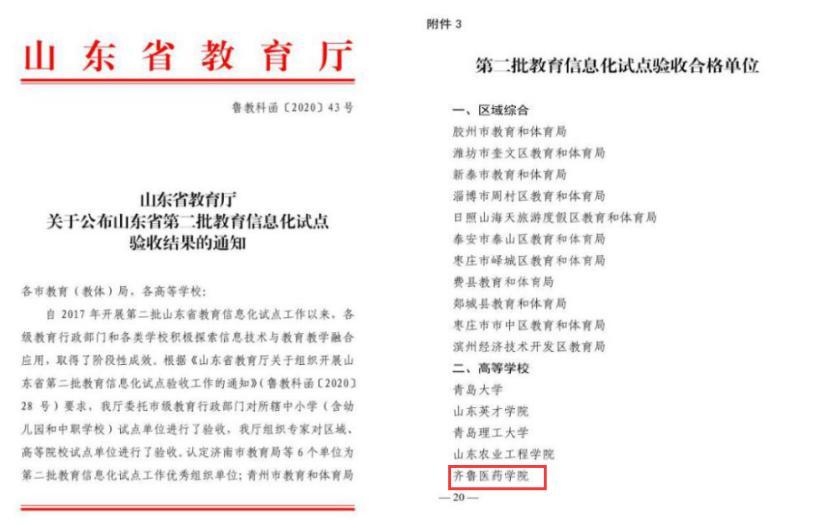 近日,从省教育厅通知文件获悉,齐鲁医药学院顺利通过山东省第二批教育信息化试点验收。
