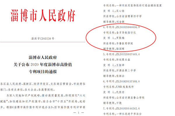 近日,从《淄博市人民政府关于公布2020年度淄博市高价值专利项目的通报》(淄政字〔2021〕8号)文件获悉,齐鲁医药学院1项专利被评为2020年度淄博市优秀学生发明项目。获奖专利为口腔医学院罗殷梅同学发明的实用新型专利《备牙导板指示仪》,指导教师陆国辉。