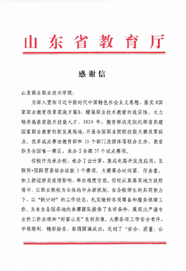 近日,省教育厅给山东商院发来感谢信,对学校在承办全国职业院校技能大赛改革试点赛中作出的贡献予以肯定,向学校及师生表示衷心的感谢。