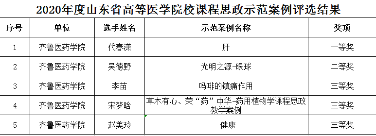 2月1日,根据山东省高等医学教育研究中心《关于公布2020年度山东省高等医学院校课程思政示范案例评选结果的通知》,齐鲁医药学院申报的5项案例均获得奖项,其中一等奖1项,二等奖1项,三等奖3项。