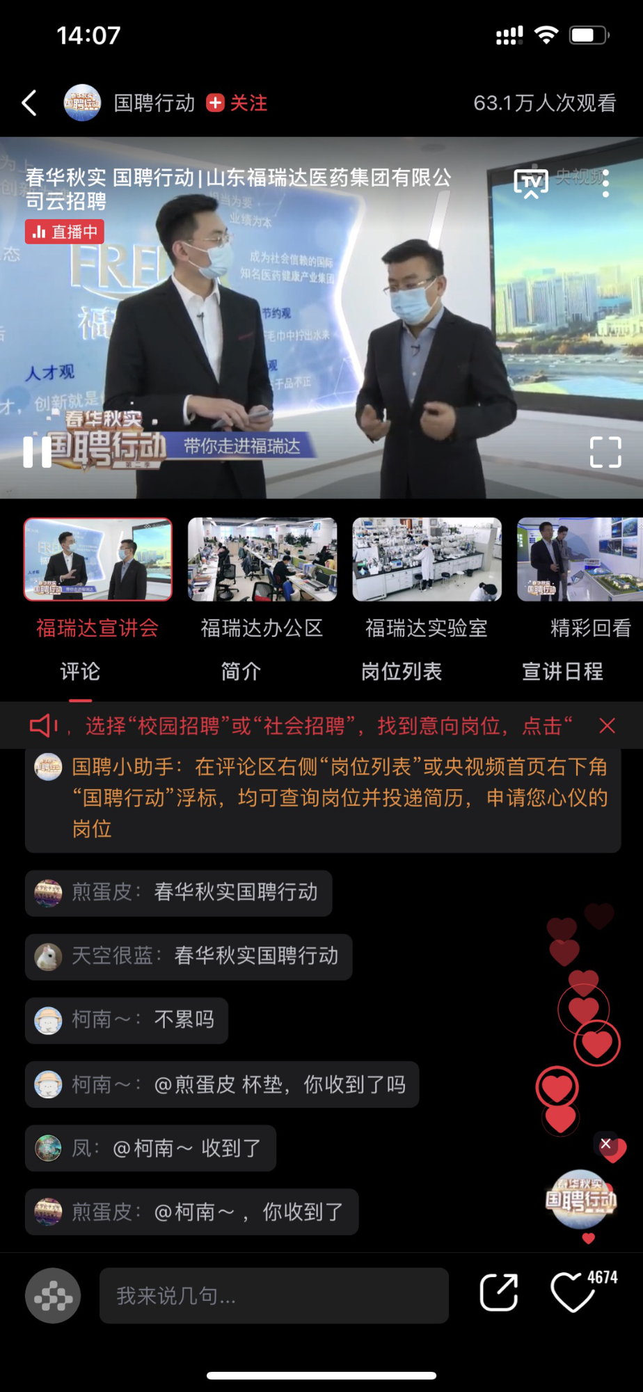此次“国聘行动”福瑞达招聘专场直播持续1小时45分钟,互动评论18630条,网上累计观看突破550万人次,引发在校大学生、各方面人才持续关注、积极参与,反响热烈。