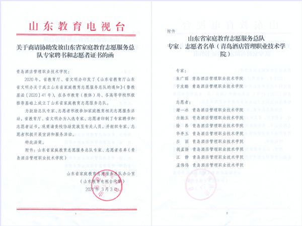 近日,山东省家庭教育宣讲团和志愿者服务总队成立,青岛酒店学院朱广丽、于友鹏两位老师入选家庭教育宣讲团专家,谢一冰等8位老师入选志愿者。