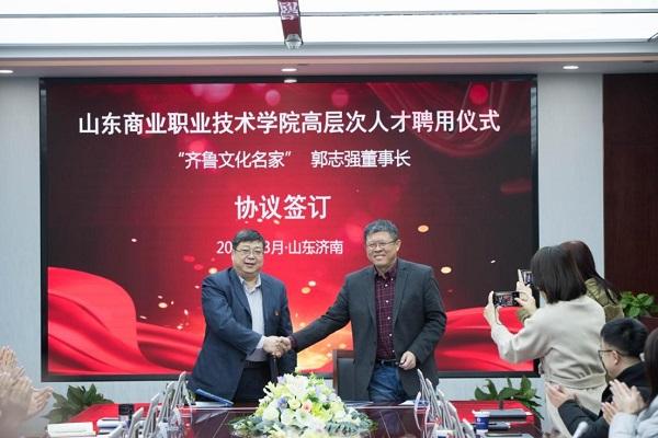 现场签约后,徐红为“齐鲁文化名家”郭志强颁发国家级高水平专业群“市场营销专业群”建设顾问聘书,张宗国为山东商院客座教授颁发聘书。
