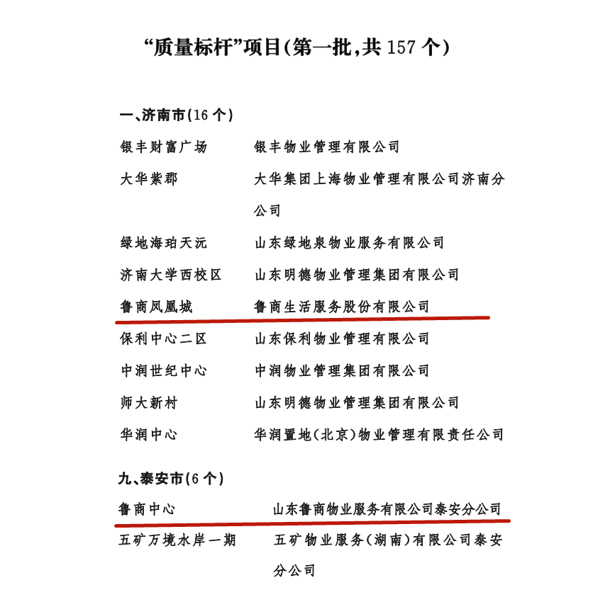 4月19日,山东省住房和城乡建设厅(以下简称省住建厅)发布有关通知,公布品牌建设典型示范案例和“质量标杆”项目(第一批),鲁商服务在管的鲁商凤凰城和泰安鲁商中心两项目被评为“质量标杆”项目。