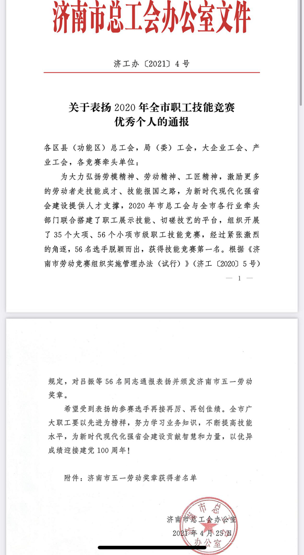 近日,济南市总工会发布《关于表扬2020年全市职工技能竞赛优秀个人的通报》,鲁商服务员工冯文君被授予2020年度“济南市五一劳动奖章”称号。