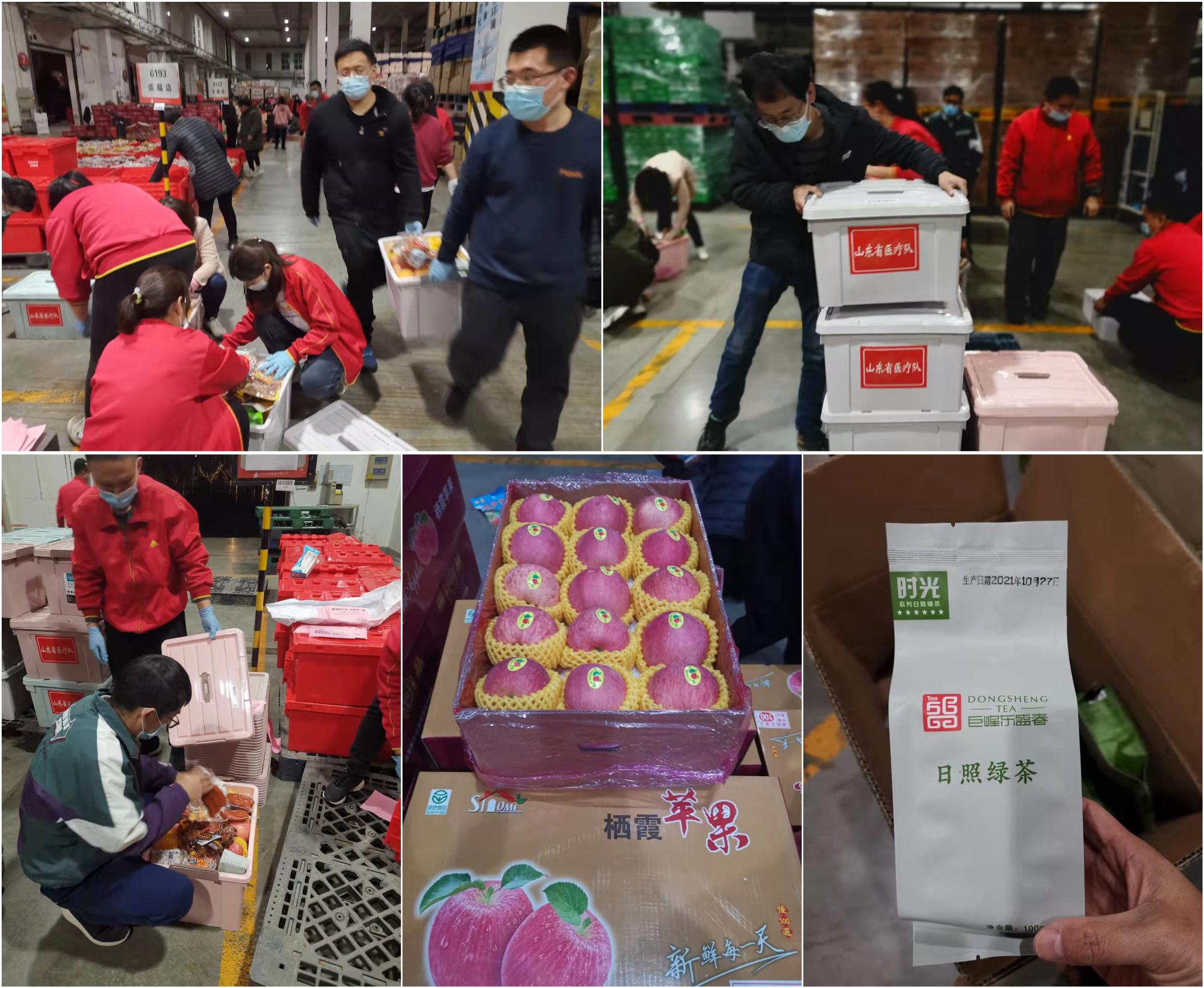 为丰富医疗队员的物资供给,超市事业部联合银座广场店紧急统筹货源,精心选品10余种,包含方便面、自热米饭、肉蛋肠菜、牛奶、巧克力以及带有浓浓家乡味的红富士苹果和日照绿茶。4月4日晚,银座配送中心紧急调度百余人通宵奋战,圆满完成1200份物资的分装。4月5日清晨,配合省交通运输厅安排的专车将生活物资包运往上海。