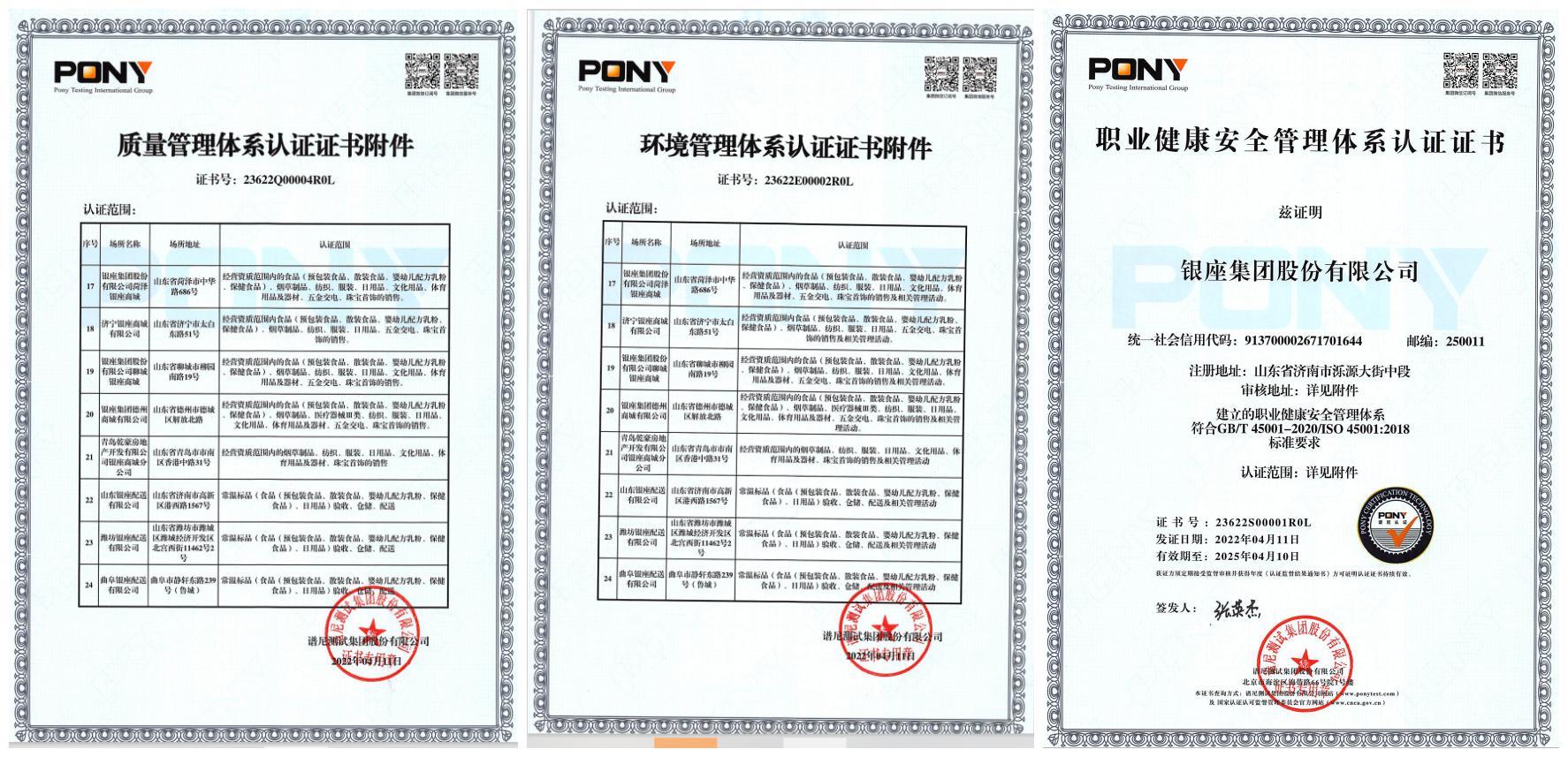 近日,银座集团顺利通过ISO9001质量管理体系、ISO14001环境管理体系、ISO45001职业健康安全管理体系“三体系”标准认证。