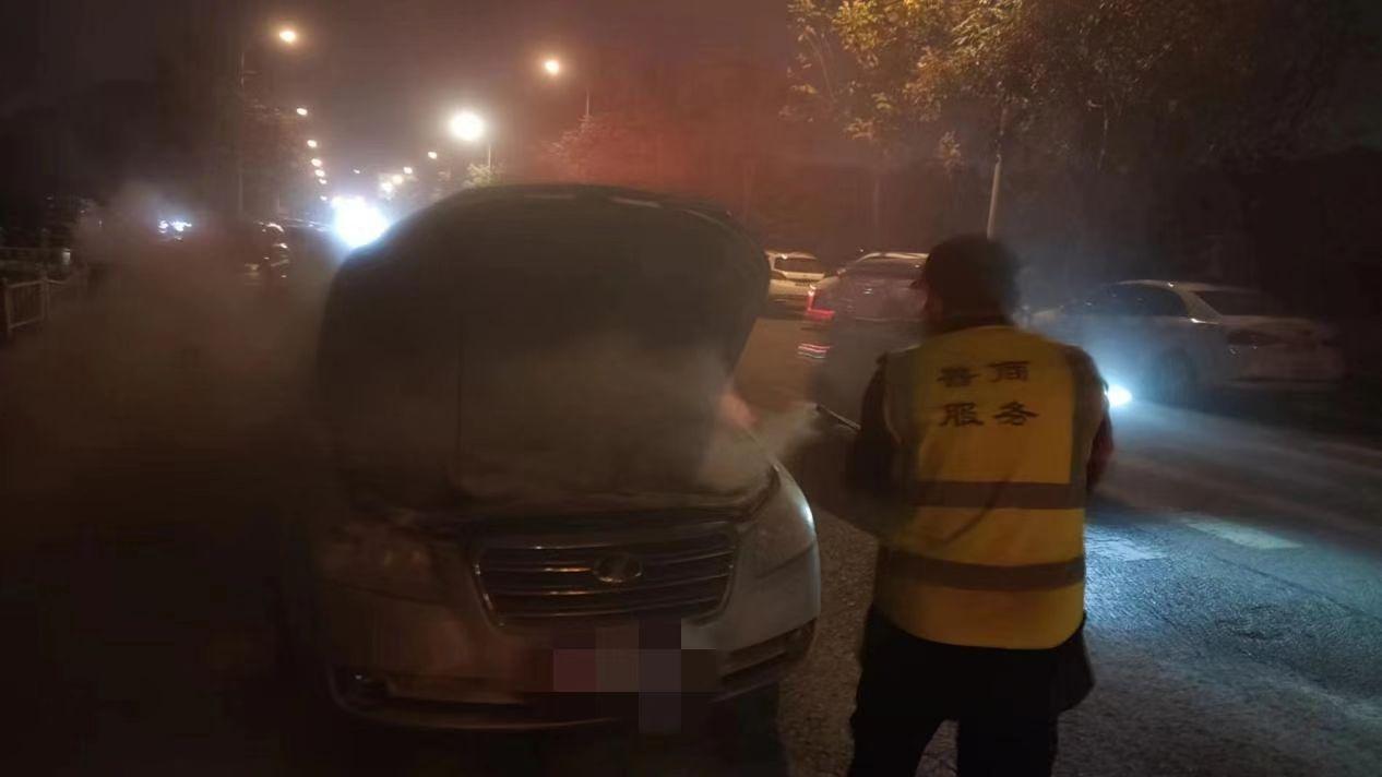 此时正值下班高峰期,小区出入车辆较多,项目立即启动应急救援机制,一名秩序队员对进入园区的车辆进行扫码登记,迅速疏导周边车辆,其余队员携带门岗配备的灭火工具赶往自燃车辆附近进行灭火,明火扑灭后,持续对发动机进行喷洒降温,确保人员安全。