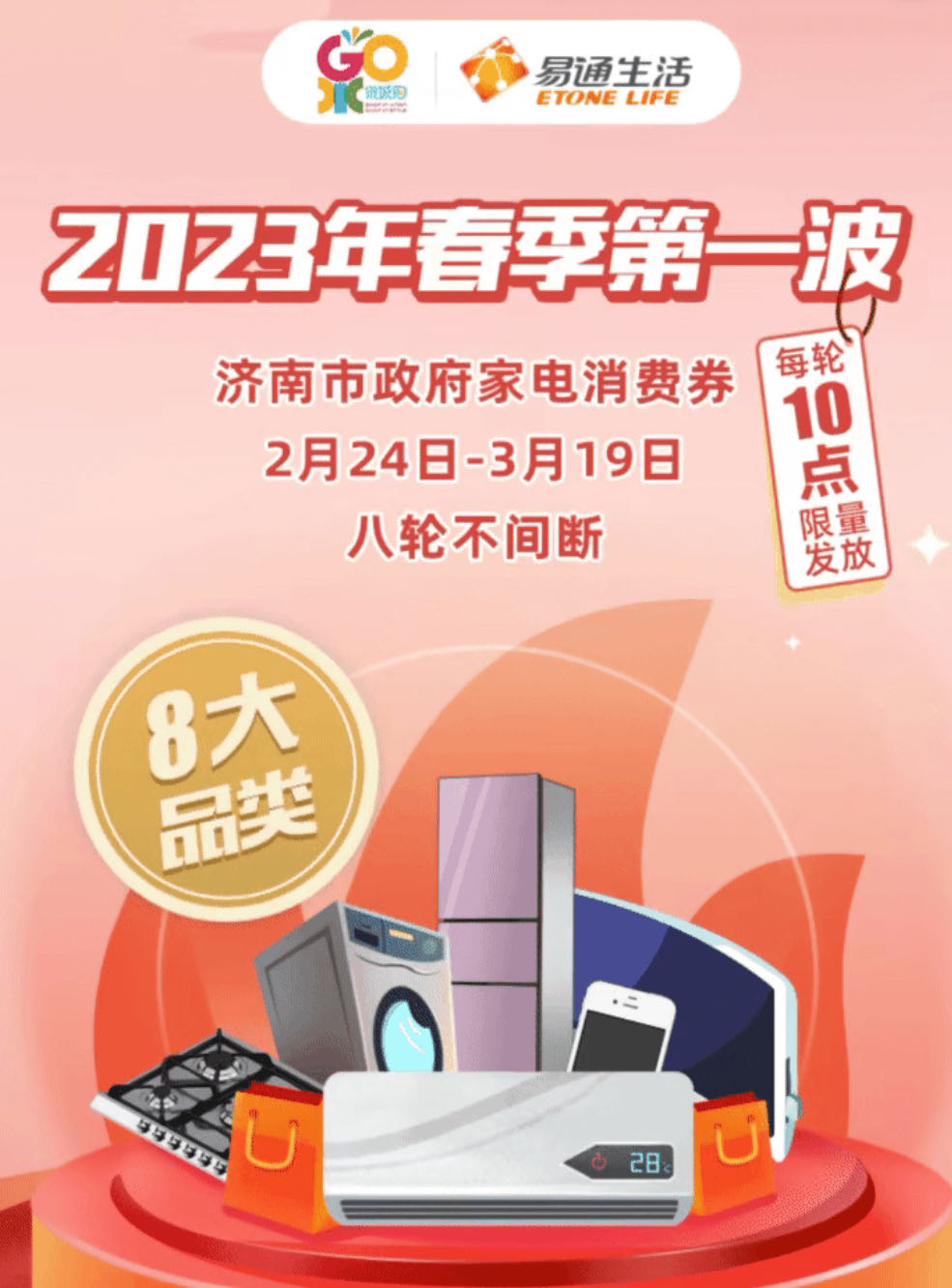 易通金服发挥数字化科技优势,成功入围济南市商务局2023-2025年消费券发放备选平台企业,助推泉城消费提质升级,释放市场消费活力。前两期济南市“泉城购”政府家电消费券已于2月24日、27日在“易通生活”平台小程序上线发放,泉城市民反响热烈,上线即被抢空。第三期将于3月2日上午10:00准时开抢。
