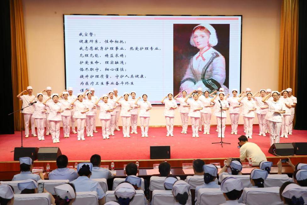 授帽仪式上,护生代表身着统一的护士服,步履坚毅、端庄稳重地走到舞台中央,护理前辈们为护生戴上圣洁的燕帽,点燃手中的红烛。庄严的气氛让现场每个人深感护理工作的崇高和光荣。在铮铮誓言中,同学们表达了自己为护理事业奋斗终身的决心。