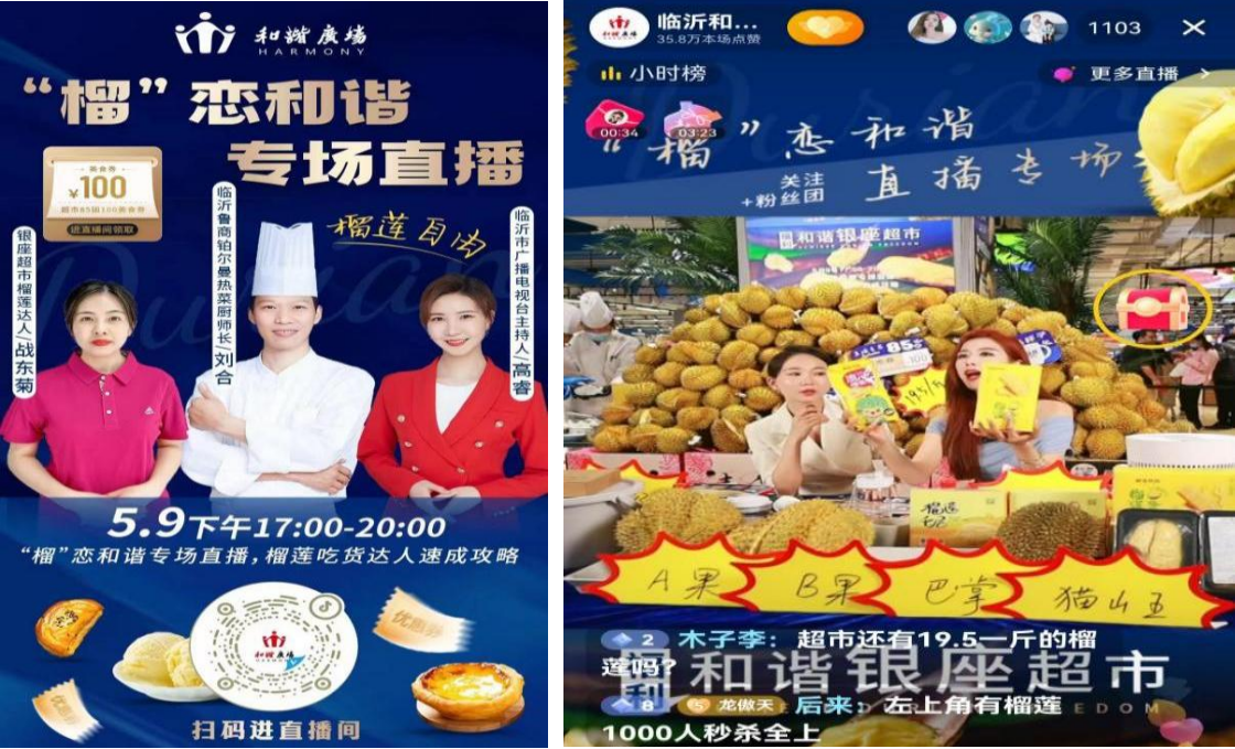 凭借前期积累的优秀口碑,5月9日,临沂和谐店以“榴恋和谐 品鉴美食”为主题,联合临沂铂尔曼大酒店及网红达人围绕榴莲品种分类、等级挑选、相关美食制作等开启直播,直播当天,线上团券销售30.71万元,直播间曝光38.38万人次。