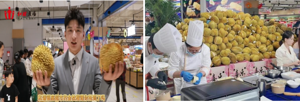 4月29日至5月3日,临沂和谐店超市焕新开业之际,借助公司统一订购泰国金枕榴莲的价格优势,门店进行大堆头陈列,提前两天在抖音进行预售团购,销售团券近80万元。