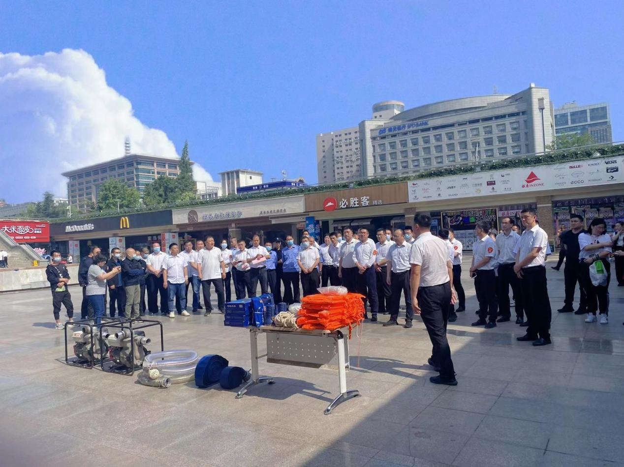 银座广场店负责人从牢固树立安全发展理念、做安全知识的传播者并熟练掌握安全应急技能、切实增强风险防范意识向公司各单位发出倡议。广场店安全队员针对汛情开展应急处置演练并介绍相关经验。