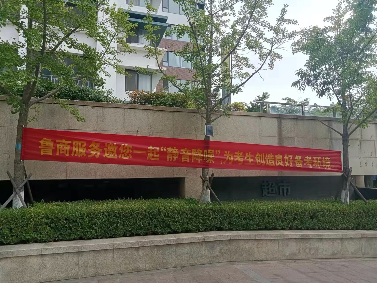 在蓝岸国际项目,工作人员在小区内悬挂各类标语,号召业主为广大考生营造良好的备考环境,同时发放传单,建议广场舞群体错时锻炼,为高考生创造良好的休息环境。