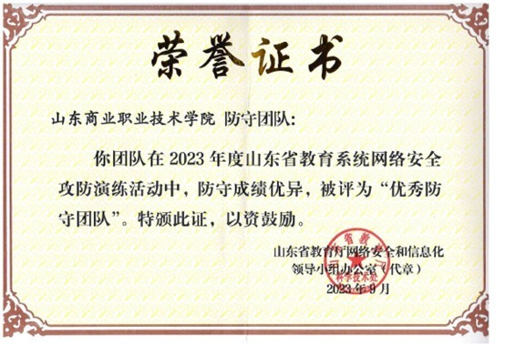 9月12日,2023年国家网络安全宣传周山东省校园日活动启动仪式上对2023年度山东省教育系统网络安全攻防演练表现突出的攻击队伍和优秀防守单位进行现场表彰,山东商职学院获评“优秀防守团队”。