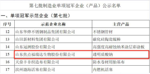 2022年10月26日,焦点福瑞达作为透明质酸钠行业优秀企业,凭借专业化程度高、企业创新能力强以及品质理念突出等优势,成功入选第七批国家级制造业单项冠军企业。此前,焦点福瑞达已被认定为国家级专精特新“小巨人”、 “国家高新技术企业”、山东省瞪羚企业、山东省第六批制造业单项冠军示范企业、山东省“一企一技术”研发中心。