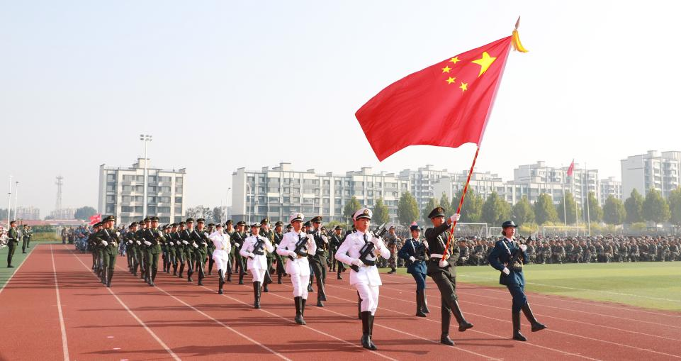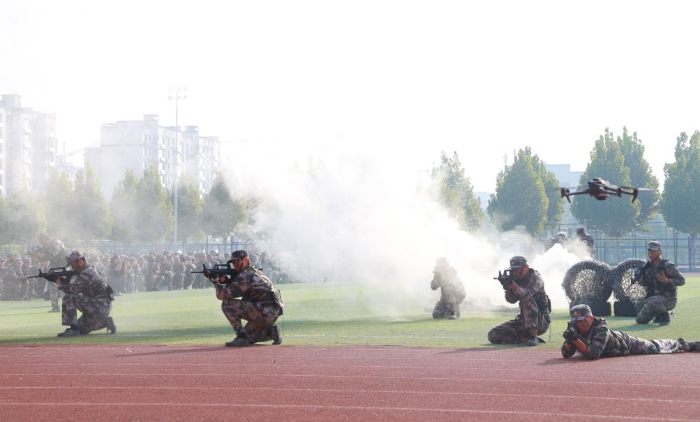 典礼在雄壮的国歌声中开始。军训汇演环节依次展示了女子匕首操、应急棍术、刺杀操、综合战地救护等特色表演项目,并进行了分列式汇演,同学们精神抖擞地通过主席台接受检阅,展现出朝气蓬勃的青春风貌。