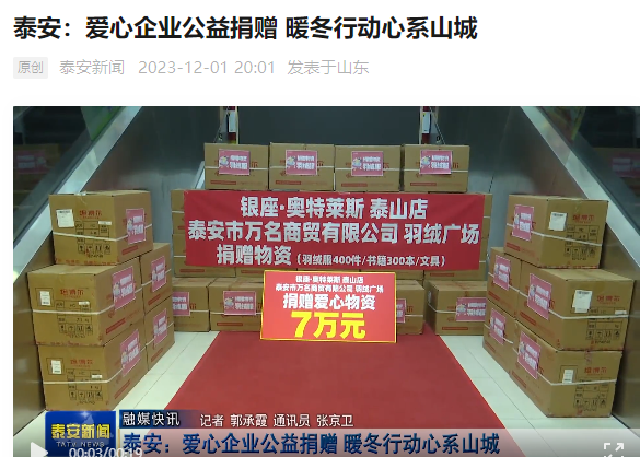 12月1日,“暖冬行动,心系山城”东西部协作公益捐赠活动在银座泰莱区域泰山店举行,门店携手泰安市万名商贸有限公司向山东省中投慈善公益基金会捐赠价值7万余元的羽绒服、书籍、文具等物资,帮助重庆市的困难儿童温暖过冬、好好学习。