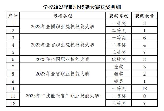在全国职业技能大赛中,学院师生获优胜奖3项;在全省职业技能大赛中共获得奖项6项,其中金奖3项、银奖2项、铜奖1项;在“技能兴鲁”职业技能大赛中获奖33项,其中一等奖18项、二等奖8项、三等奖7项。