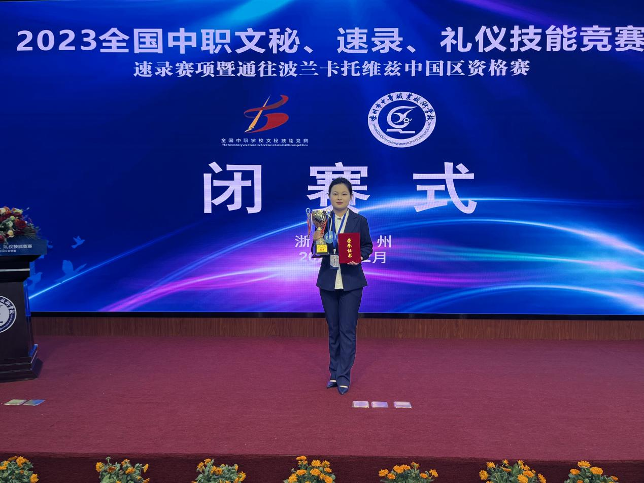 近日,2023全国中职文秘、速录、礼仪技能竞赛速录赛项暨通往波兰卡托维兹中国区资格赛在浙江嵊州落下帷幕。山东城市服务职院商务文秘专业选手孙雨彤以542字/分的成绩,斩获“极限看打”全国冠军,获得波兰卡托维兹国际速联大赛的入场券。