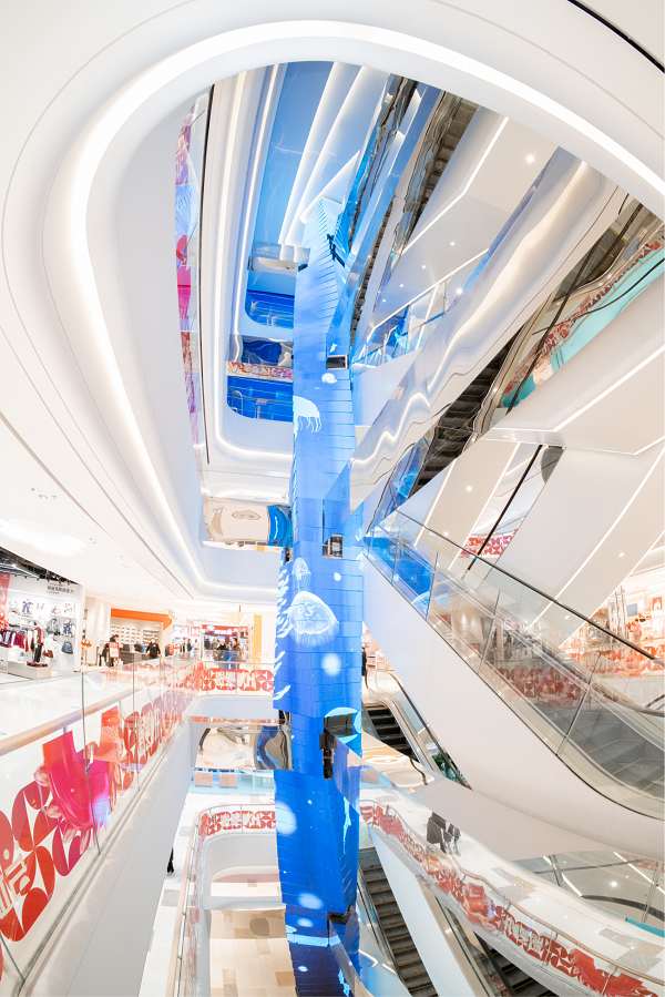 东期二楼中庭打造“创艺星场”,设置全国最高的 LED 螺旋扭屏,为消费者带来极具科技感的交互体验。