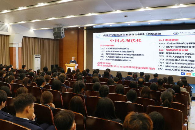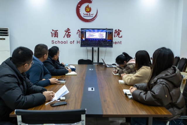 学院相关职能部门负责人、各二级学院党总支书记和学生代表在学术报告厅主会场听讲,学院教职员工和其他年级学生同步收看网络直播。
