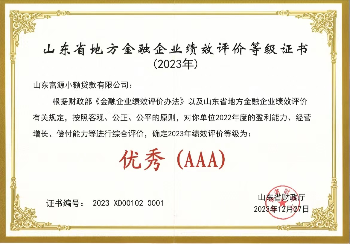 近日,富源小贷荣获省财政厅颁发的2023年山东省地方金融企业绩效评价“优秀(AAA)”等级证书,这是公司连续5年获此殊荣。