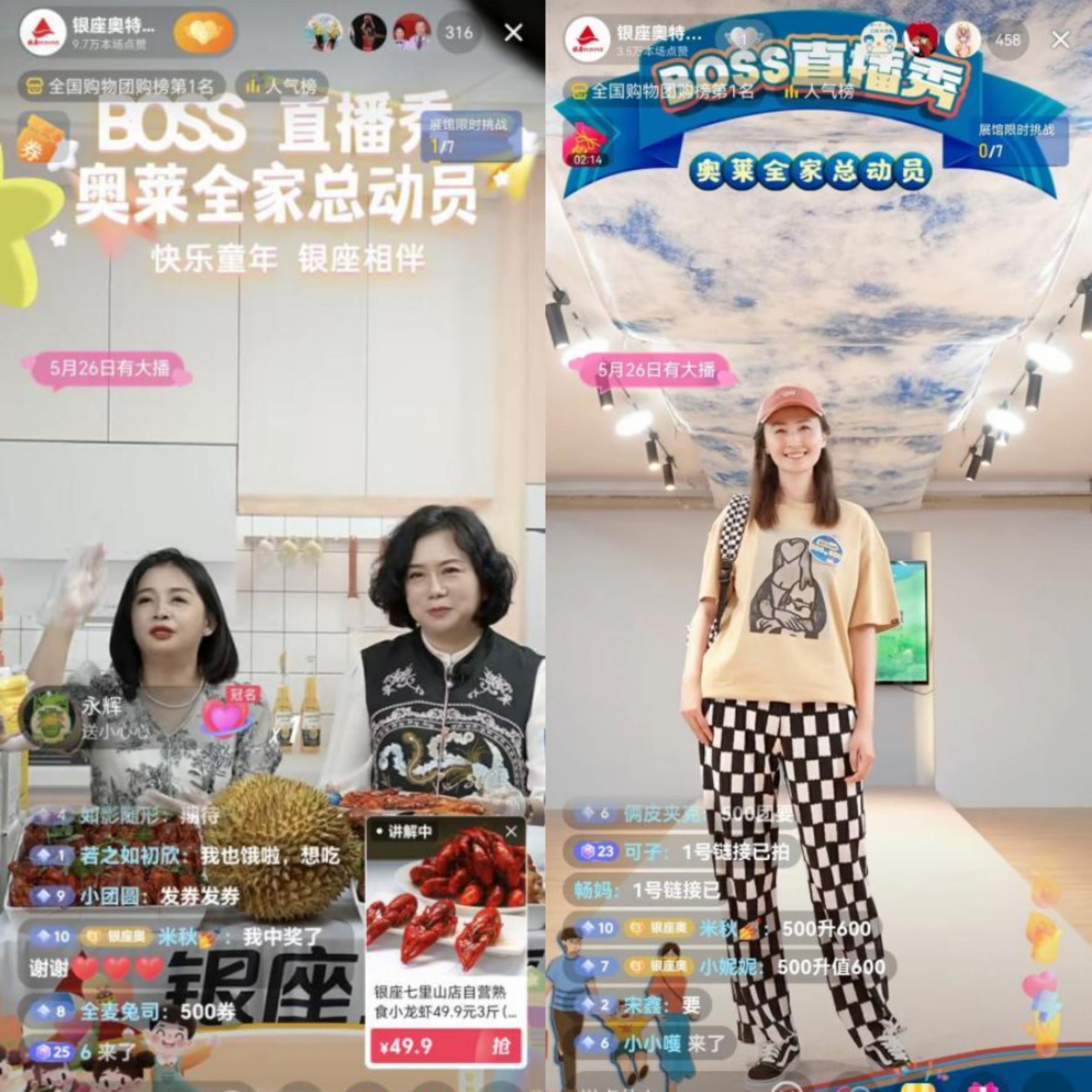 BOSS直播期间,新直播间同时启用百货“秀场”和超市“厨房”双场景,依次呈现成长加油、青春的你、冲鸭打工人、清凉消夏、甜蜜生活等主题,为考生家长、白领、情侣等群体推荐商品,“中考加油妈妈团”“上阵父子兵”、超市“岁月静好美食团”等创新搭配,吸引众多消费者关注。本次活动战果丰硕,4小时直播GMV111.47万元,直播间累计曝光超28万,累计点赞13万次,荣登抖音全国购物团购榜第一名。