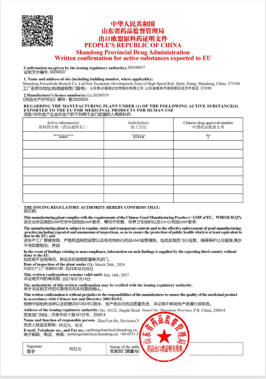 近日,经过严格审核评估,焦点福瑞达玻璃酸钠原料药成功获得了由山东省药品监督管理局签发的出口欧盟原料药证明文件(WC认证),表明企业药品生产质量体系符合GMP要求,具备向欧洲市场出口销售的资格。