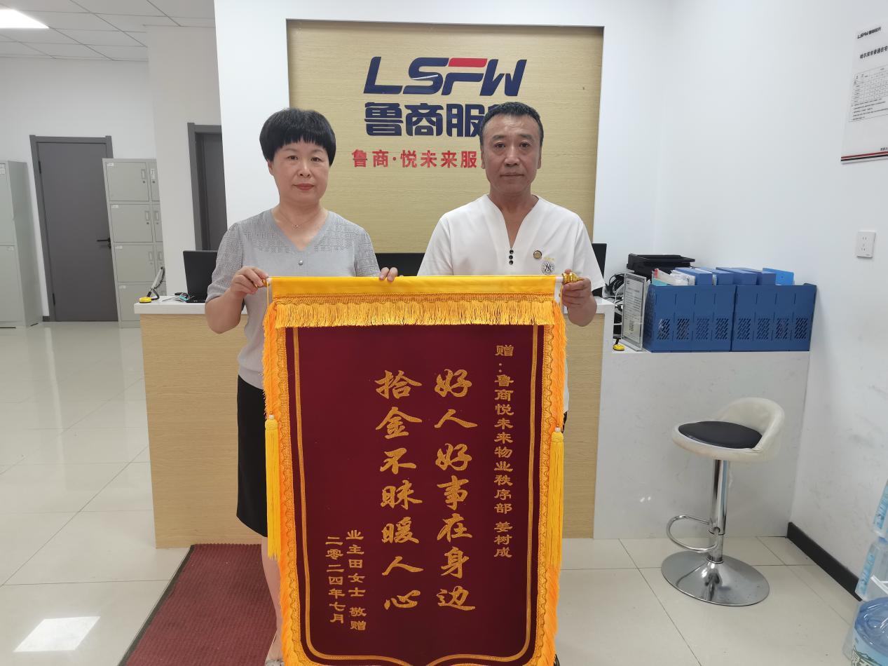 “咱们的姜队长在不在,我是来感谢他的。”鲁商服务哈尔滨城市公司悦未来的业主田女士,手拿一面印有“好人好事在身边,拾金不昧暖人心”的锦旗,来到项目服务中心,要亲手送给项目保安队长姜树成。