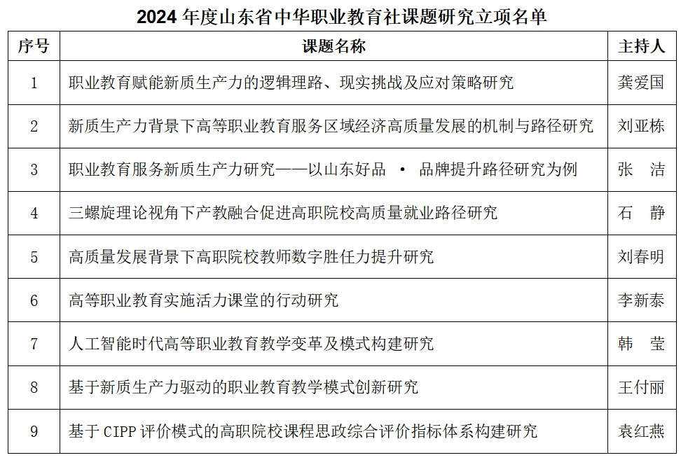 近日,山东省中华职业教育社发布了《关于 2024 年度全省职教社系统课题立项的通知》。山东商职学院9项课题获准立项,课题立项数量在全省名列前茅。