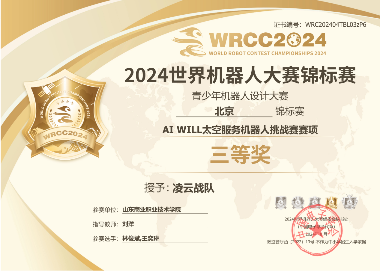 近日,2024世界机器人大赛北京锦标赛结束,山东商职学院选派的“凌云战队”在AI WILL太空服务机器人赛项中,喜获三等奖。