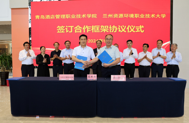 在青岛酒店管理职院,张世珍一行考察了学校烹饪学院实训基地等教学实训场所,详细了解了学校实训基地建设与运行、师资队伍建设、产教融合、人才培养等方面的情况。参观结束后,青岛酒店管理职院与兰州资源环境职业技术大学、甘肃交通职业技术学院、酒泉职业技术学院三所院校签订对口帮扶与合作框架协议。