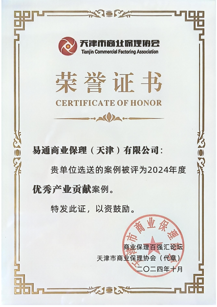 近日,2024年商业保理百强汇论坛暨第三届商业保理发展论坛召开,易通商业保理(天津)有限公司(简称:易通保理)受邀参加。此次论坛汇聚了来自全国各地的商业保理行业精英、专家学者等,超过300家机构参会,共同探讨商业保理行业的发展方向与服务实体的新路径。易通保理凭借在供应链金融领域的卓越表现和对产业发展的贡献,荣获“2024年度优秀产业贡献案例”。