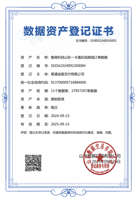 本次入表的“山东一卡通在线商城订单数据”基于公司权属单位易通金服沉淀的海量平台运营数据,鲁商科技通过深度清洗加工、合规确权、质量评价等,形成高质量数据集,并顺利获得数据资源、数据资产、数据知识产权3类登记证书。