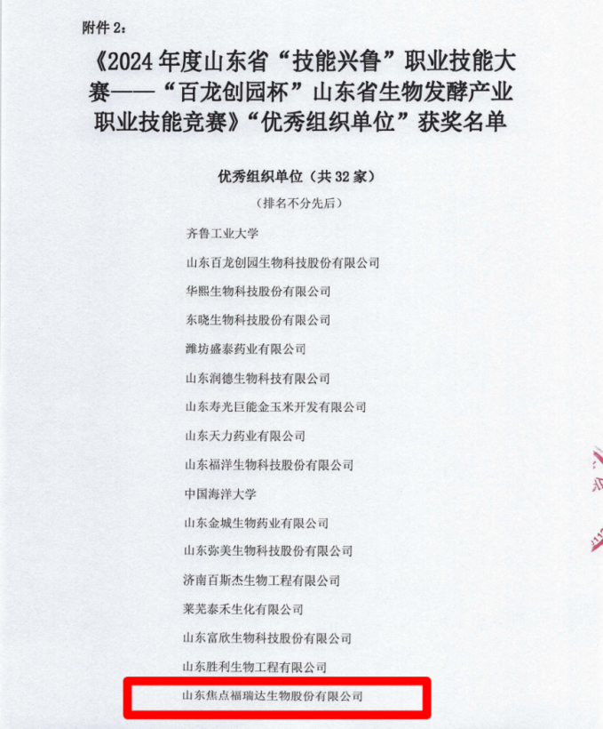 近日,2024年度山东省“技能兴鲁”职业技能大赛——山东省生物发酵产业职业技能竞赛获奖名单公布,福瑞达旗下焦点福瑞达、福瑞达生物科技、福瑞达生物股份凭借优异的竞赛成绩和良好的作风表现被大赛组委会评选为“优秀组织单位”。在职工组化学检验工、生化检验工、淀粉及淀粉糖制造工3个竞赛项目中,13名职工荣获个人一、二、三等奖。