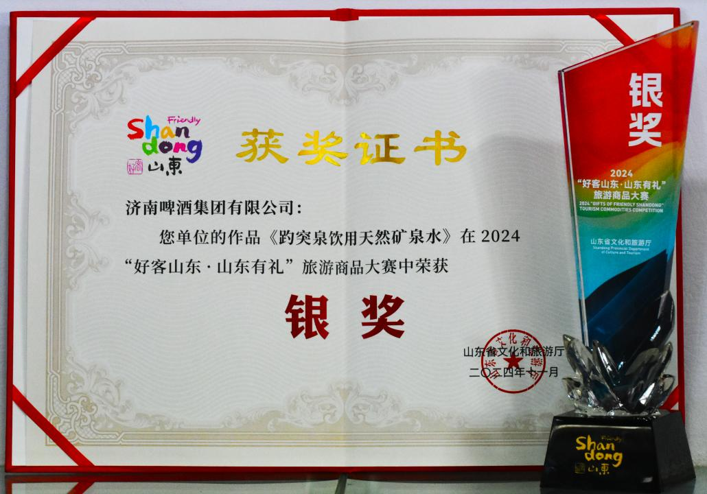 在近日举办的“好客山东 山东有礼”旅游商品大赛中,鲁商投资旗下济啤集团趵突泉矿泉水凭借其卓越的品质与深厚的文化底蕴荣获银奖。