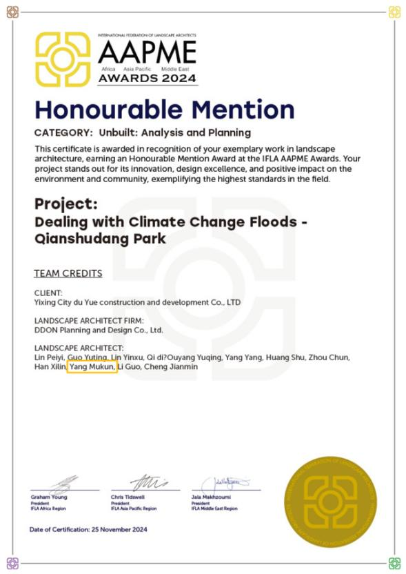 近日,国际风景园林师联合会(IFLA)正式公布IFLA AAPME Awards 2024国际风景园林师联合会亚太景观设计奖获奖名单,青岛酒店管理职院教师杨牧昆主持的宜兴钱墅荡公园项目荣获分析与规划类铜奖。