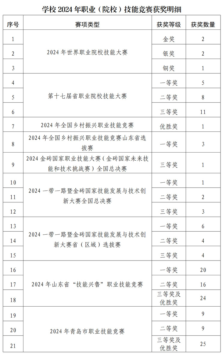 在2024年山东省“技能兴鲁”职业技能竞赛中,学校师生获一等奖20项、二等奖16项、三等奖及优秀奖24项。在青岛市第十七届职业技能竞赛中获一等奖或金奖9项、二等奖或银奖9项、三等奖及优胜奖25项。另外,学校师生在山东省大学生科技节、海峡两岸职业院校技能竞赛、各类国家级协会组织主办的技能竞赛等省级以上赛项中获奖100余项。