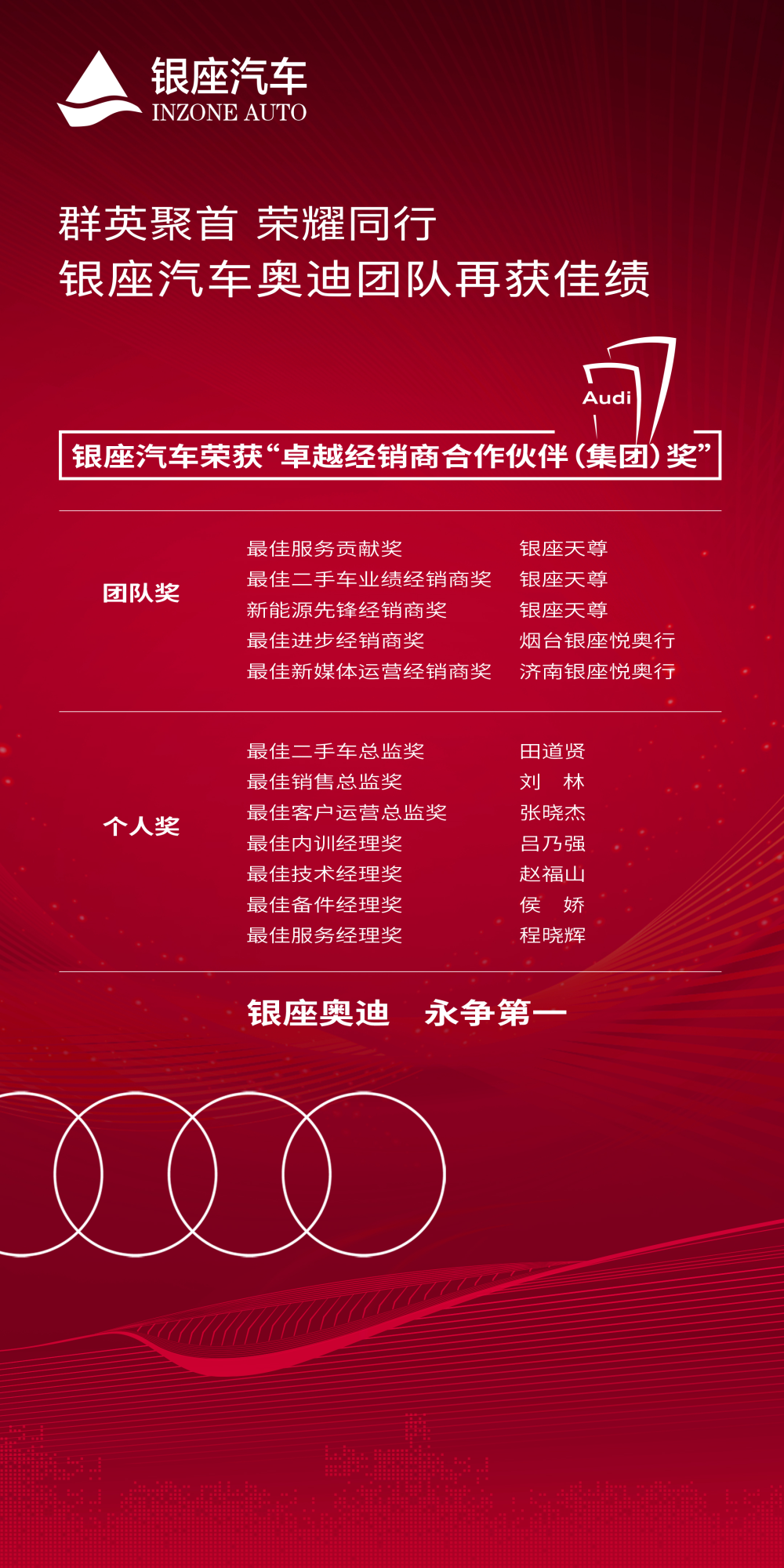 近日,在一汽奥迪特许经销商品牌体验日和2025一汽奥迪东北区特许经销商年会上,银座汽车及旗下公司获一汽奥迪卓越经销商合作伙伴(集团)奖、最佳服务贡献奖、最佳二手车业绩经销商奖、新能源先锋经销商奖、区域最佳进步经销商奖、最佳新媒体运营经销商奖多个奖项,在个人奖项上亦有多项斩获。