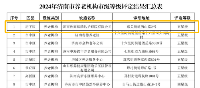 近日,济南市养老服务设施等级评定委员会揭晓2024年市级等级评定结果,济南鲁商福瑞达护理院再度荣膺“五星级养老机构”称号,这也是自2017年开业以来连续第七年蝉联此殊荣。
