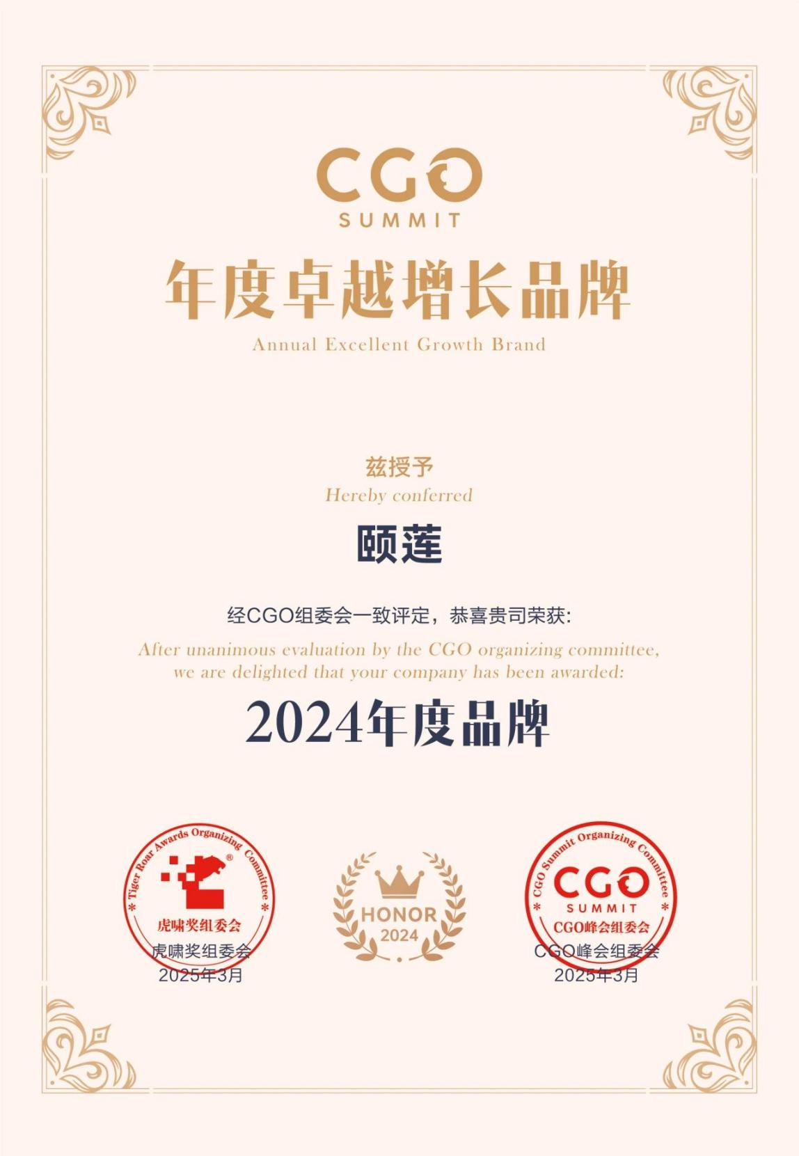 近日,在2025(第三届)CGO品牌增长峰会上,颐莲凭借卓越的品牌策略、市场拓展能力及持续的创新精神,经过专家评审团多轮严格筛选与数据维度验证,在众多参选品牌中脱颖而出,荣膺2024年度卓越增长品牌殊荣。