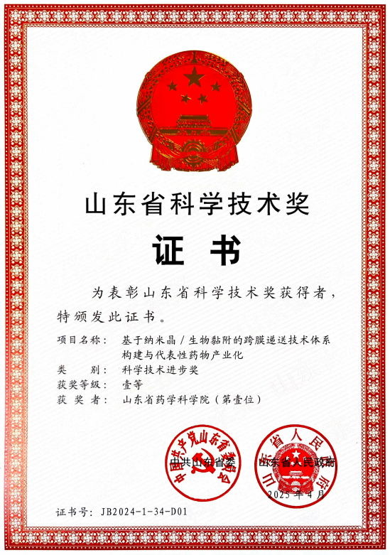6月27日,山东全省科技大会在济南召开,山东省药学科学院牵头研发的《基于纳米晶/生物黏附的跨膜递送技术体系构建与代表性药物产业化》项目荣获省科学技术进步奖一等奖。